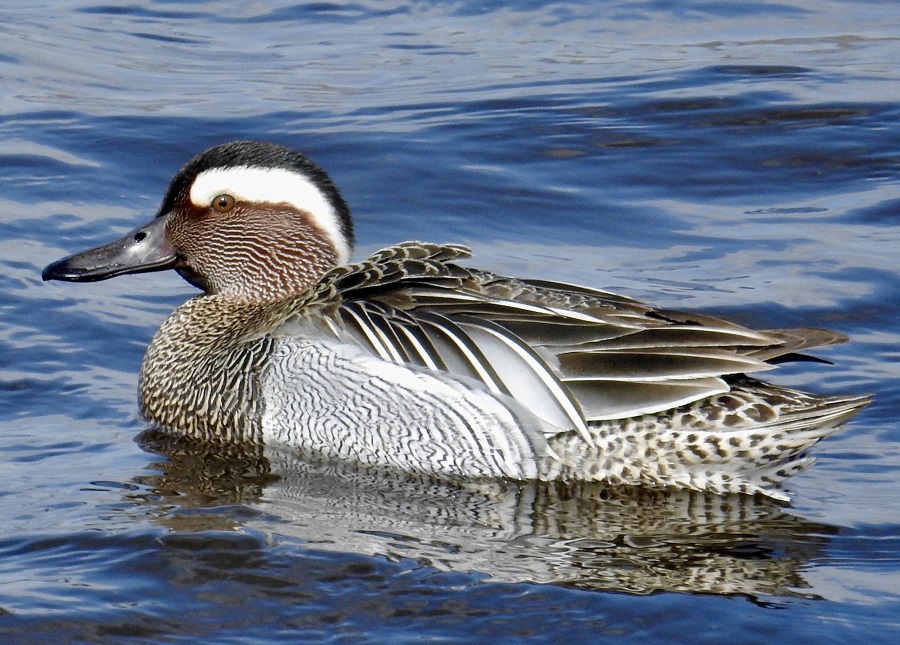 La Marzaiola ha dimensioni di poco superiori a quelle dell’Alzavola, collo sottile, becco diritto e più lungo della testa. Il maschio presenta una banda bianca che dall’occhio si estende alla nuca, petto bruno screziato, fianchi sono grigio vermicolati, addome bianco…